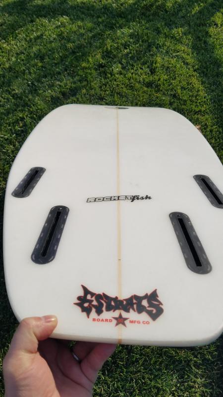 Shaped by Mike Estrada and Epoxy Rocket Fish, 6'0 L, 22" Wide, 2-7/8" Thick, Squash Tail, with Quad Future Fins boxes (ride as a quad or twin), Single to Double bottom concave, and 48.3 Liters. Got my new board, time part with this awesome board, works great in most waves! No dings, but pressure dings on the deck.